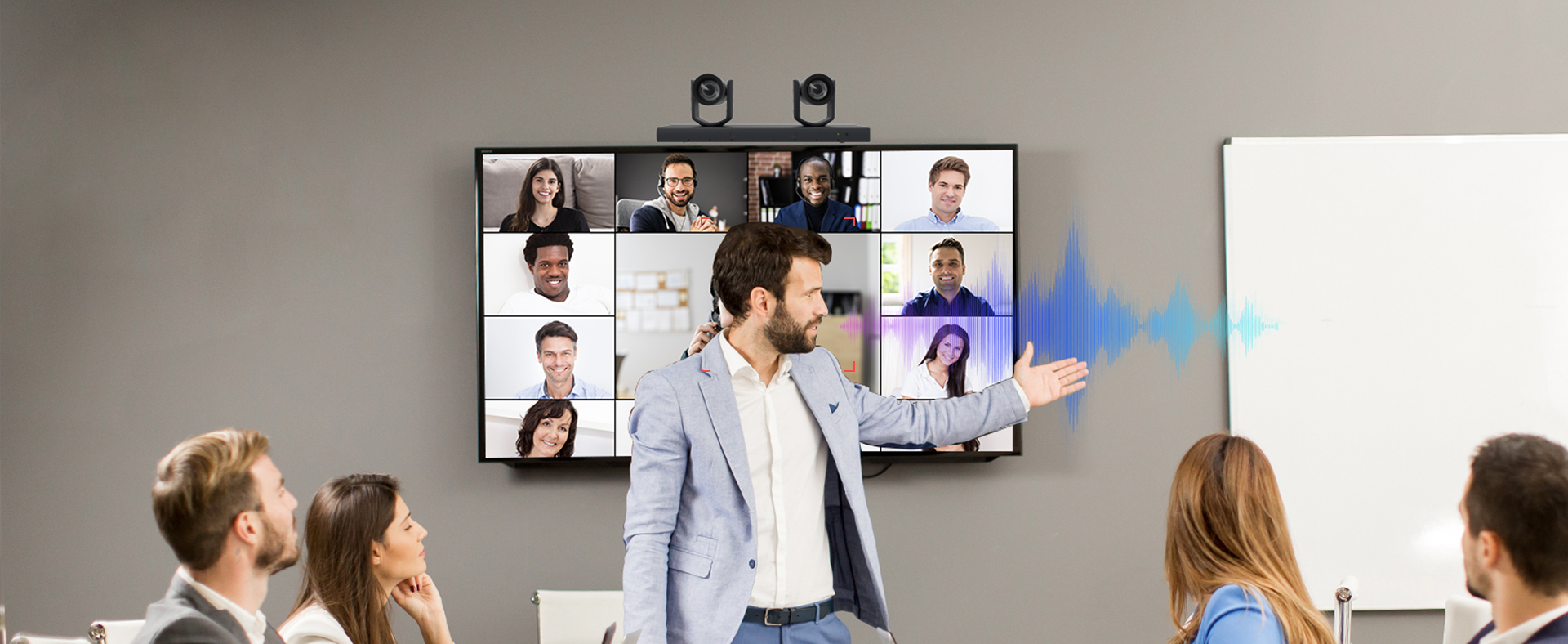 語音定位是AI智能分析,定位跟蹤會場發言人員,內置多個音頻收音模塊,當發言者發聲時候,攝像機分析音頻方位,并快速運算處理,指揮攝像機快速聯動轉向特定的位置,拍攝特寫鏡頭,實現聲像定位智能技術。